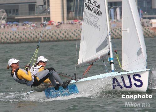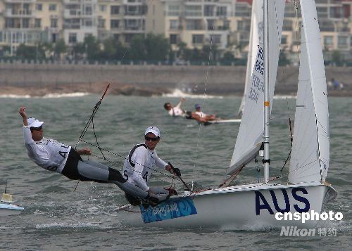 8月18日,北京2008奥运帆船比赛在青岛分赛场举行,澳大利亚队内森·威尔莫特、马尔科姆·佩奇组合和埃莉斯·雷基基、特莎·帕金森组合分获男子双人艇四七0级和女子双人艇四七0级冠军。中新社发 赵振清 摄