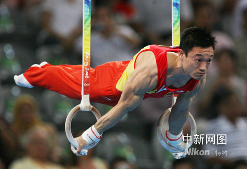 8月18日,中国选手杨威在北京奥运会吊环决赛中表现出色,夺得银牌。中新社记者 武仲林 摄