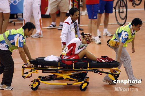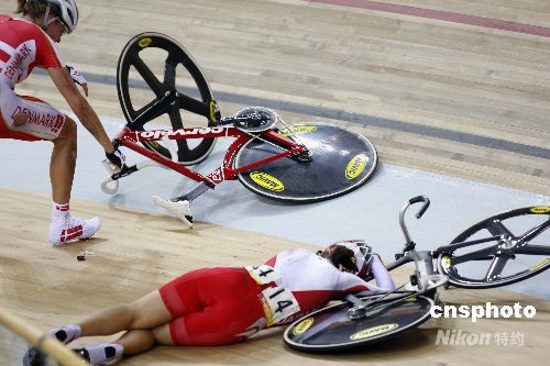 8月18日,场地自行车女子记分赛决赛在北京老山自行车馆进行,14号日本选手和田见里美在比赛中与其他选手相撞受伤。 中新社发 盛佳鹏 摄