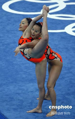 8月18日,北京奥运会花样游泳比赛在“水立方”拉开帷幕,在首场比赛双人技术自选项目中,日本选手原田早穗、铃木绘美子以48.250的总分排名第三位。中新社发 杜洋 摄