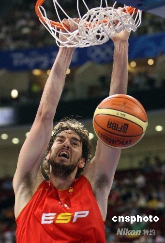 北京奥运会男篮小组赛最后一轮赛事8月18日在北京五棵松篮球馆举行,此前三胜一负的世锦赛冠军西班牙队以98比50击败非洲冠军安哥拉;安哥拉队五战五负,小组垫底。西班牙的超级巨星保罗·加索尔仅仅上场23分钟,不仅砍下全场最高的31分,而且严密的防守让对手往往无功而返,充分体现了“领袖气质”。中新社发 任晨鸣 摄