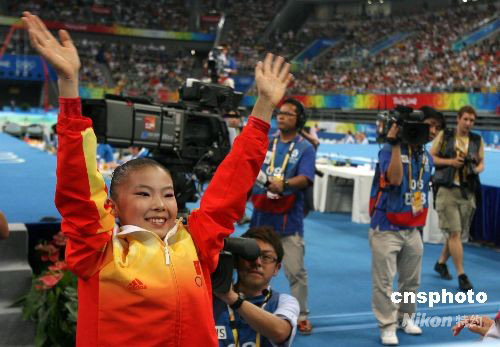 8月18日,中国选手何可欣在北京奥运会女子高低杠决赛中表现出色,夺得金牌。 中新社发 武仲林 摄