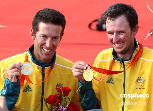 8月18日,北京2008奥运帆船比赛在青岛分赛场举行,澳大利亚队内森·威尔莫特和马尔科姆·佩奇组合获得双人艇男子470级冠军。 中新社发 赵振清 摄