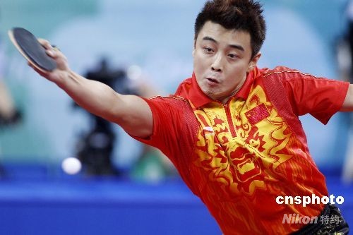 8月18日,北京奥运会乒乓球男子团体决赛在北京大学体育馆举行,王皓将为中国队打头阵,战胜德国队的新秀奥恰洛夫,为中国队拿下第一分。中新社发 盛佳鹏 摄