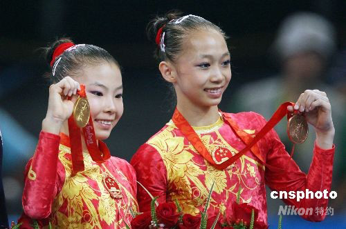 8月18日,中国选手何可欣(左)在北京奥运会女子高低杠决赛中16.725分的成绩夺得金牌,队友杨伊琳获得铜牌。 中新社发 武仲林 摄