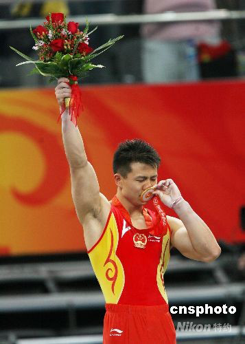 图:陈一冰、杨威分获奥运会男子吊环金银牌