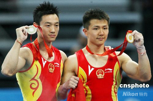 8月18日,中国选手陈一冰(右)在北京奥运会男子吊环决赛中以16.6分的成绩夺得金牌,另一位中国选手杨威获得银牌。 中新社发 武仲林 摄