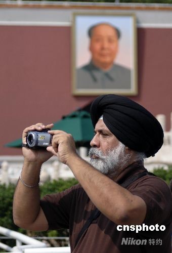 8月18日,一外国游客在毛主席像下认真拍摄天安门。当天,北京晴空万里,天安门广场吸引大批游客前来游玩。中新社发 王东明 摄