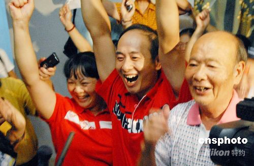 何雯娜父母在福建龙岩东城区家中为女儿夺得奥运冠军欢呼。 中新社发 林风 摄