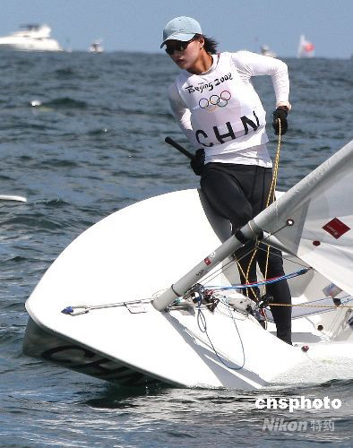 北京2008奥运帆船比赛8月19日在青岛继续举行,女子激光雷迪尔级进行奖牌轮(决赛)争夺,中国选手徐莉佳获得铜牌。 中新社发 赵振清 摄