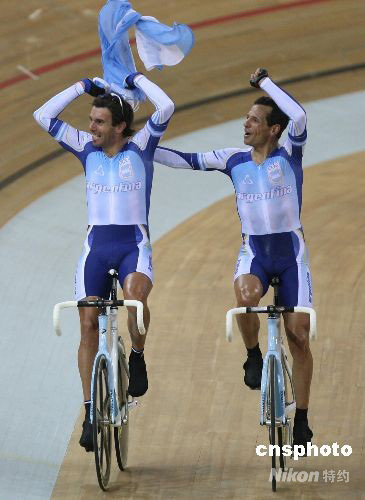 8月19日,阿根廷队在北京奥运会场地自行车麦迪逊赛上夺得金牌。 中新社发 武仲林 摄