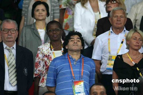 8月19日晚,北京奥运会男足第二场半决赛在北京工人体育场举行,球王马拉多纳到场观看巴西、阿根廷两强遭遇战。 中新社发 任晨鸣 摄
