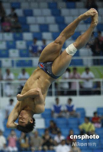 8月19日晚,在国家游泳中心“水立方”进行的北京奥运会男子3米跳板决赛中,中国选手何冲以572.90分夺得金牌,中国代表团金牌总数增至43枚。 中新社发 杜洋 摄