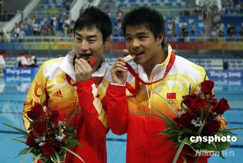 何冲(右)以572.90的总分获得金牌,秦凯获得铜牌。