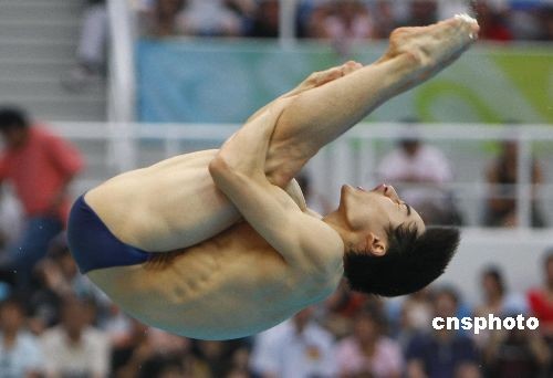 8月19日晚,北京奥运男子3米跳板决赛在国家游泳馆“水立方”举行,中国选手秦凯以572.90分获得铜牌。他的队友何冲以572.90分夺取金牌。 中新社发 杜洋 摄