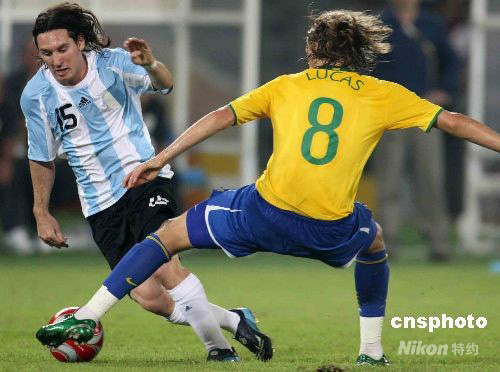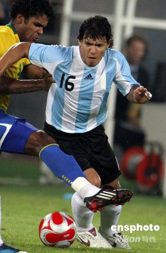 8月19日晚,北京奥运会男足第二场半决赛在北京工人体育场举行,阿根廷、巴西两支强队提前相遇,最终阿根廷队以3比0完胜巴西队,进入决赛。 中新社发 任晨鸣 摄