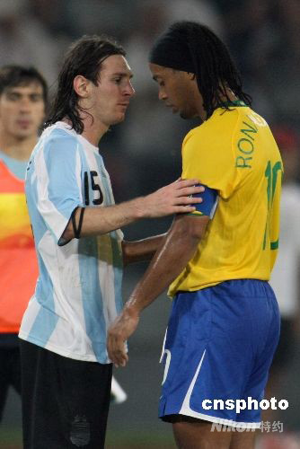 8月19日晚,北京奥运会男足第二场半决赛在北京工人体育场举行,由球星梅西领衔的阿根廷队以3比0淘汰巴西队进入决赛。赛后,梅西与巴西队队长罗纳尔迪尼奥拥抱并安慰这位好友。 中新社发 任晨鸣 摄