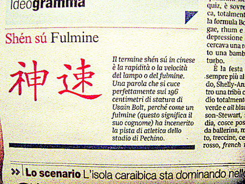 这个“汉字”专栏自北京奥运会开幕之日起,每天一期、每期一词,每个词都标注拼音,引出一段新闻。如8月8日的专栏词汇是“鸟巢”,在这两个汉字下面用意大利语解释了“鸟巢”在汉语中的本意,介绍了北京的国家体育场,并配上焰火照耀下的“鸟巢”夜景图片。其后的专栏相继刊登了“文身”、“兴奋剂”、“球门”、“地区”、“神速”等汉语词汇。在汉字“兴奋剂”下报道的新闻是:奥组委为实现“干净的奥运会”已向兴奋剂宣战,北京设立了由220名高级专家组成的超级检测中心,每天检测数量达250例。“神速”一词解读的新闻是:这个在汉语中意为闪电般快速的词,恰如其分地描绘了飞人博尔特17日晚破百米纪录的情景。这名身高196cm的运动员,以其闪电般的速度征服了北京国家体育场内的所有观众。(记者穆方顺)