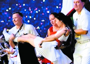 图为开幕式上三位波兰朋友在救助中国女孩。