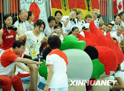 8月19日,中国选手郭晶晶在观看比赛前和福娃合影。当日,北京奥运会跳水比赛在国家游泳中心——“水立方”继续进行,何冲在男子3米跳板决赛中获得冠军。 新华社记者赵鹏摄