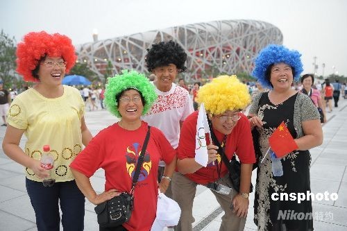 北京奥运会吸引来自众多国家的运动员和热情观众的参与,奥林匹克风在北京奥林匹克公园激情上演。图为中国百姓头戴奥运五色帽助兴。中新社发 陈文 摄