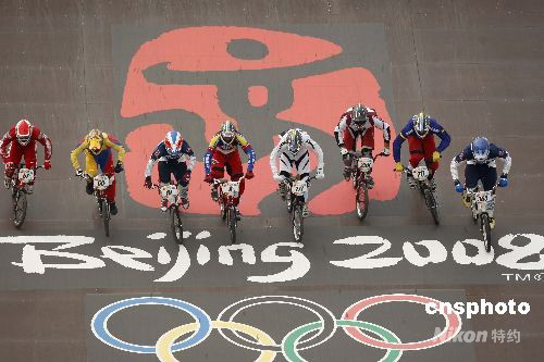 8月20日,北京奥运会男子小轮车竞速赛在北京老山小轮车赛场进行了1/4决赛的争夺。经过三轮的较量,最终来自世界各国的16位选手成功进入了半决赛的较量,他们将在明天展开新一轮的争夺。图为比赛现场。 中新社发 盛佳鹏 摄