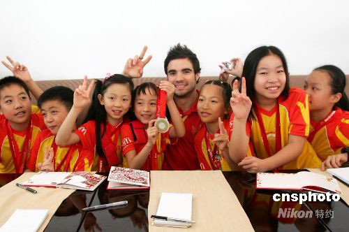 8月20日,在北京奥运会加拿大代表团的奥运之家内,加拿大跳水金童德斯帕蒂(中)与来自中国各省份的小朋友一起分享他昨日刚刚夺得的奥运会跳水男子三米板银牌。中新社发 富田 摄