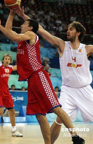 8月20日,北京奥运会男子篮球八进四淘汰赛在五棵松篮球馆开战,2006年世锦赛冠军西班牙队在球星保罗·加索尔的率领下,以72比59战胜欧洲劲旅克罗地亚队。保罗·加索尔(白)上场26分钟,砍下全场最高的20分。中新社发 任晨鸣 摄