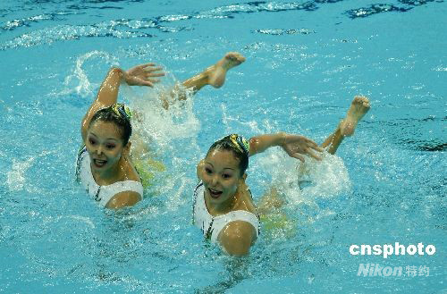 8月20日,在北京奥运会花样游泳双人自由自选决赛中, 中国花样游泳“姐妹花”蒋婷婷、蒋文文排名第四,无缘奖牌。金牌被俄罗斯组合摘得。中新社发 杜洋 摄