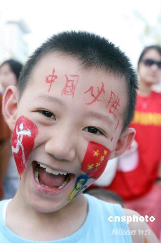 随着北京奥运会各项赛事的全面展开,人们观看奥运的热情持续高涨。许多观众和游客的脸上、手上或贴或画国旗、北京奥运会会徽及奥运五环标志等,表达对奥运的愉悦心情。中新社发 陈晓根 摄