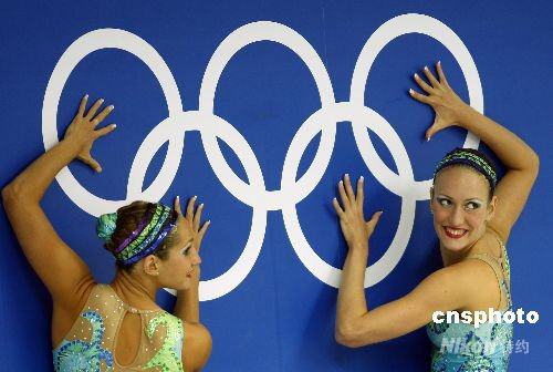8月20日,北京奥运会花样游泳双人项目比赛全部结束,选手赛后在“水立方”奥运五环标志前拍照留下靓影。 中新社发 杜洋 摄