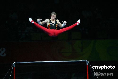 图为精彩的单杠表演。