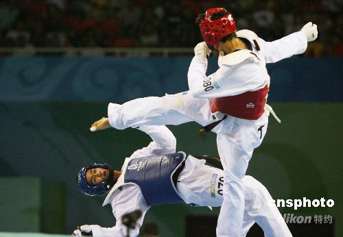 8月20日,中华台北选手朱木炎(红衣)战胜泰国选手楚差瓦·考劳,夺得北京奥运会跆拳道男子58公斤级铜牌。