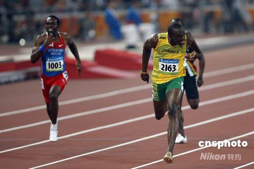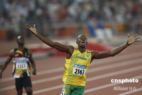 8月20日晚,国家体育场举行的北京奥运会男子200米决赛中,牙买加选手尤塞恩·博尔特以19.30创造新的世界纪录并获得金牌。这是他在本届奥运会上继百米金牌后夺得的第二枚金牌。 中新社发 盛佳鹏 摄