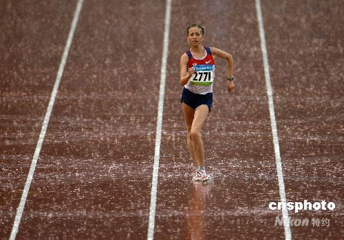 北京奥运会女子20公里竞走8月21日上午在大雨中举行,俄罗斯选手奥莉加·卡尼斯金娜以1小时26分31秒的成绩获得金牌;挪威选手谢斯蒂·蒂瑟·普拉策以1小时27分07秒的成绩夺得银牌;意大利选手埃莉萨·里高多以1小时27分12秒的成绩获得铜牌。中国选手刘虹成绩为1小时27分17秒,名列第四,无缘奖牌。 中新社发 任晨鸣 摄