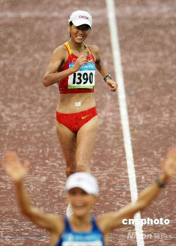 北京奥运会女子20公里竞走8月21日上午在大雨中举行,中国选手刘虹最终成绩为1小时27分17秒,名列第四,无缘奖牌。中新社发 任晨鸣 摄