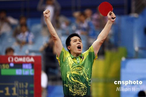 8月21日,北京奥运会乒乓球男子单打第三轮的比赛在北京大学体育馆进行,中国香港选手高礼泽4比2战胜韩国名将柳承敏晋级下一轮比赛。中新社发 盛佳鹏 摄