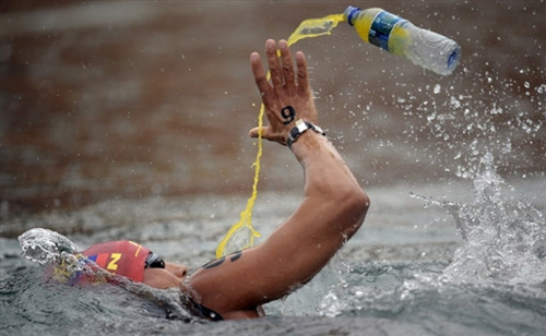 8月21日,北京奥运会男子10公里马拉松游泳项目进行。在比赛过程中,参赛选手中途补充水分的方式极为特别。