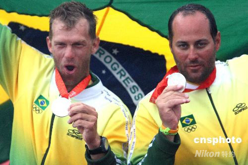 8月21日,2008奥运帆船比赛在青岛分赛场进行最后一天比赛,在男子龙骨艇-星级-奖牌轮比赛中,巴西组合罗伯特·沙伊特/布鲁诺·普拉达获得银牌。 中新社发 赵振清 摄