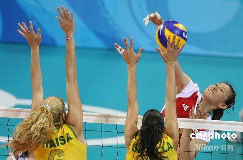 8月21日,中国女排在北京奥运会女排半决赛中以0:3负于巴西队,无缘决赛。中新社发 武仲林 摄