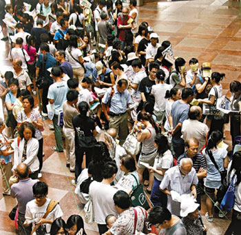 21日早尖沙咀文化中心的轮候人龙达500多人。升读中四的郝灏扬,20日晚9时在尖沙咀文化中心排队,“以前试过打电话购票,但电话不通,我担心买不到门票,所以晚上立即出家门赶到文化中心排队,想不到会排头位。”经过整夜守候,郝灏扬最终购得4张大汇演及2张体操表演的门票,他表示十分期待一睹杨威及李小鹏的风采,更笑言为了观看奥运,暑期功课至今仍未动笔。
