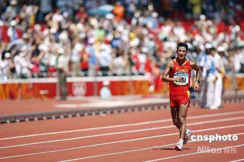 8月22日上午,北京奥运男子50公里竞走比赛中,意大利选手亚历克斯-施瓦策以3小时37分09秒夺得冠军。中国选手李建波虽奋力追赶,但还是无缘奖牌。 中新社发 盛佳鹏 摄