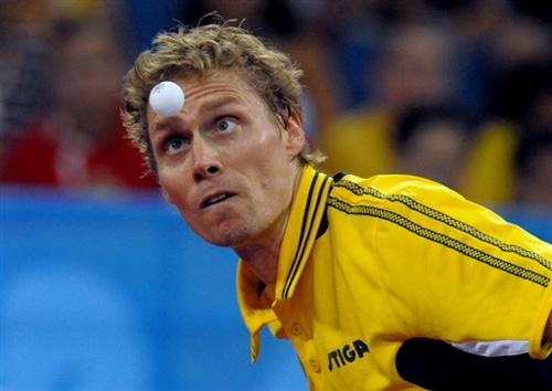 8月22日,瑞典名将佩尔森在奥运乒乓球男子单打四分之一比赛中的发球聚精会神。