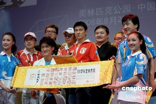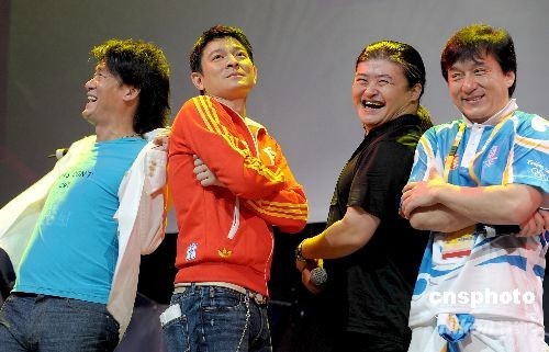 8月22日下午,明星成龙、刘欢、刘德华、周华健亮相北京奥林匹克公园,共同演唱一首《难说再见》。这首动人的歌曲将成为北京奥运跟世界话别的标志性符号。中新社发 陈文 摄