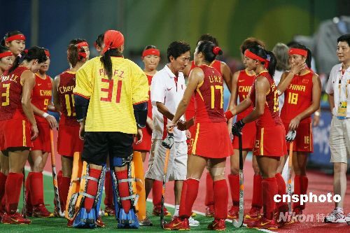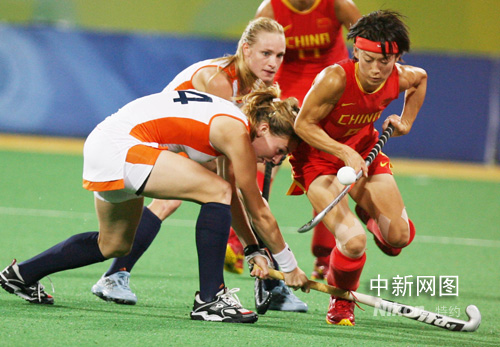 8月23日,中国女曲在北京奥运会曲棍球决赛中0:2负于荷兰队,夺得亚军,取得历史性突破。中新社记者 武仲林 摄