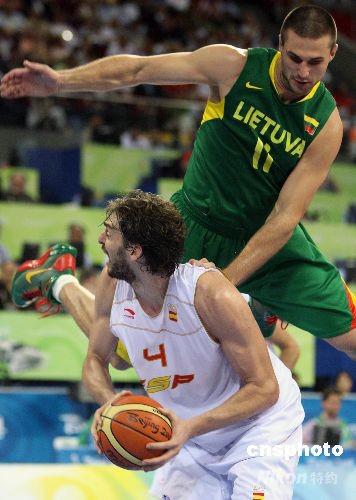 北京奥运会男子篮球半决赛首场比赛8月22日晚在五棵松篮球馆开战,2006年世锦赛冠军西班牙队以91比86艰难战胜极为强悍的立陶宛队,率先进入决赛。NBA球星4号保罗·加索尔砍下全场最高的19分。 中新社发 任晨鸣 摄