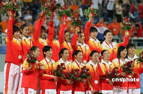 8月22日晚,中国女曲在北京奥运会曲棍球决赛中以0:2憾负荷兰队,收获一枚银牌,创下中国曲棍球项目有史以来的最好成绩。 中新社发 武仲林 摄