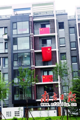 中国运动员的住楼挂满了五星红旗。
