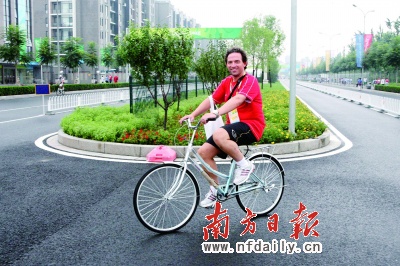 外国运动员在奥运村路上骑自行车。