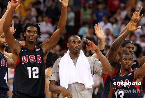 8月22日晚,北京奥运会男子篮球半决赛第二场比赛在五棵松篮球馆开战,美国“梦八队”最后以101比81战胜上届奥运会冠军阿根廷队,进入决赛。赛后,科比率领美国众球星向观众敬礼致谢。中新社发 任晨鸣 摄